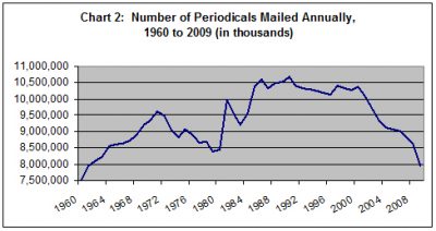 Perhaps the oddest proxy of gun ownership rates was the use of Guns & Ammo magazine. Before commercialization of the Internet, this might have been a viable proxy. But as the U.S. Postal Service confirms in this chart, they don’t deliver many magazines these days, with the drop-off mirroring the switch to online activity.